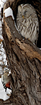昨日の流れで、先ずE.D公園に行ってシマエナガを待ってみたが、やって来ないので、いつもの公園に行くとオオコノハズクが出ていると聞き知人等と現地に直行した。ここで20人位の人と目が開くのを待てど、その気配なし😩